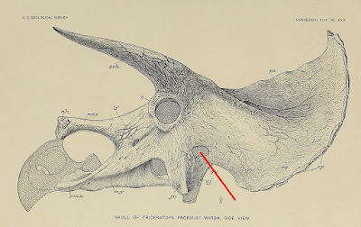 Y es que, he notado que muchísimos paleoartistas colocan el oído, o mejor dicho, la salida/entrada del canal auditivo externo (cuyo nombre técnico es meato auditivo) en esta parte del cráneo: